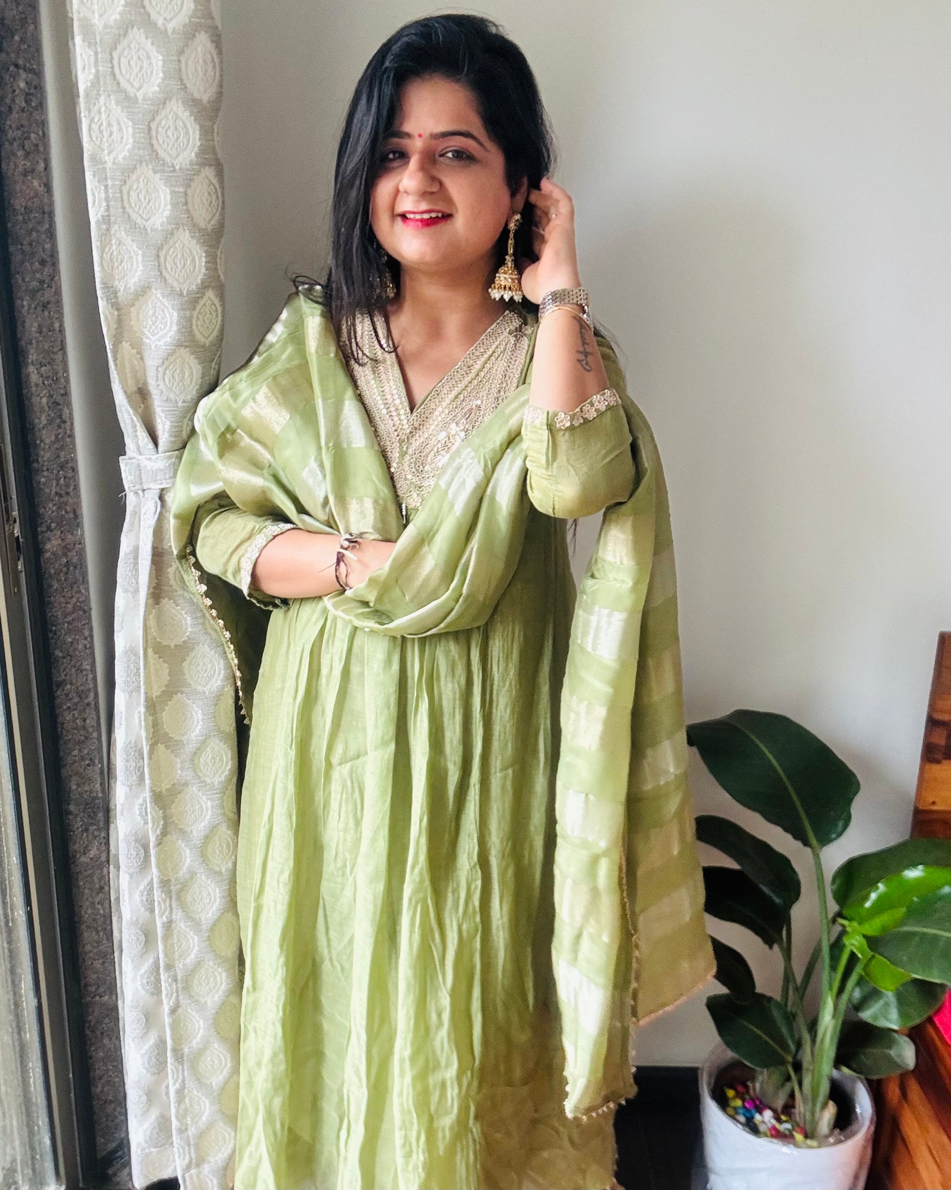 This handcrafted olive ensemble is from our latest festive edit — designed for the woman who finds grace in every fold and comfort in every drape.