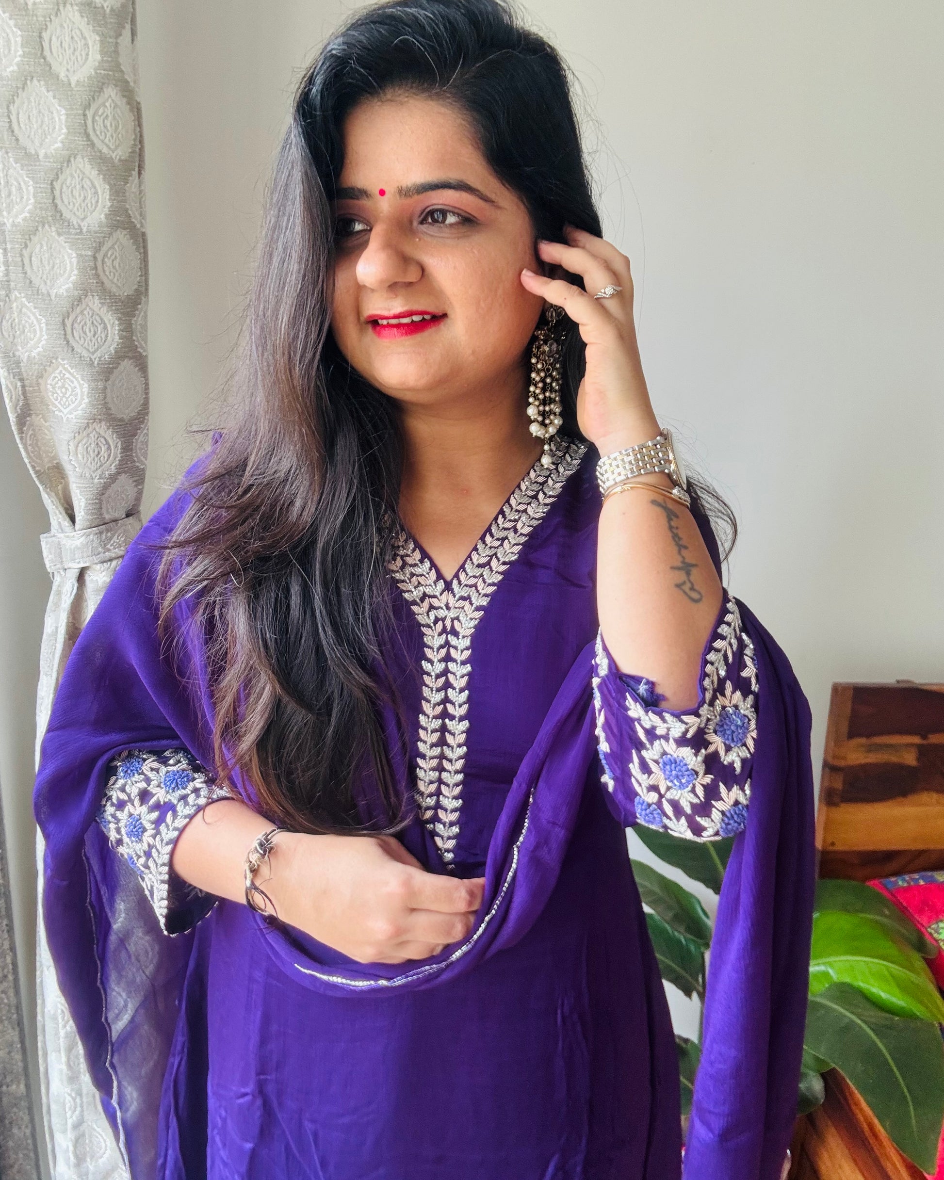 Colour that gives you royal and elegant looks every time . Add this royal purple A -line dress with detailing of silver handwork detailing 💜